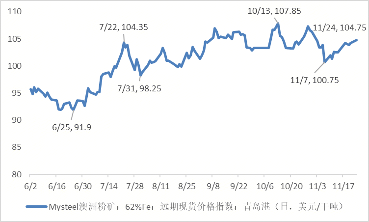 近期市場關(guān)注鐵礦石價格上漲。單從近兩周的表現(xiàn)來看, Mysteel鐵礦石62%價格指數(shù)自11月7日的階段性低點100.75美元/噸上漲至11月24日的104.75美元/噸,上漲4美元/噸,漲幅3.97%。
