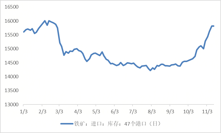 綜合影響47港進口礦庫存連續(xù)7周攀升至11月14日的15813萬噸,較國慶節(jié)前增加1262萬噸。
