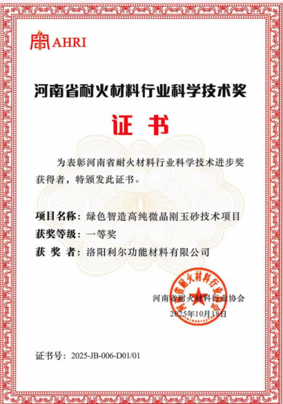 近日,2025年度河南省耐火材料行業(yè)科學(xué)技術(shù)獎(jiǎng)評(píng)選結(jié)果揭曉,洛陽(yáng)利爾功能材料有限公司申報(bào)的“綠色智造高純微晶剛玉砂技術(shù)項(xiàng)目”脫穎而出,榮獲科學(xué)技術(shù)進(jìn)步獎(jiǎng)一等獎(jiǎng),標(biāo)志著該公司在高端耐火材料綠色制造與智能化生產(chǎn)領(lǐng)域取得重大突破。