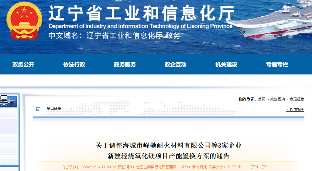 按照《遼寧省人民政府辦公廳關(guān)于推進(jìn)菱鎂行業(yè)高質(zhì)量發(fā)展的實(shí)施意見(jiàn)》(遼政辦發(fā)〔2023〕15號(hào))、《省直7部門(mén)關(guān)于做好菱鎂行業(yè)專(zhuān)項(xiàng)整治有關(guān)工作意見(jiàn)的函》(遼發(fā)改工業(yè)字〔2026〕8號(hào))、《遼寧省菱鎂礦浮選及鎂砂行業(yè)產(chǎn)能置換辦法》(遼工信建材〔2024〕18號(hào))要求,根據(jù)企業(yè)的調(diào)整申請(qǐng)及鞍山市工信局初審,我廳于2026年3月31日至4月15日,對(duì)海城市峰馳耐火材料有限公司等3家企業(yè)新建輕燒氧化鎂項(xiàng)目產(chǎn)能置換方案進(jìn)行了公示,公示期間無(wú)異議,現(xiàn)予通告。