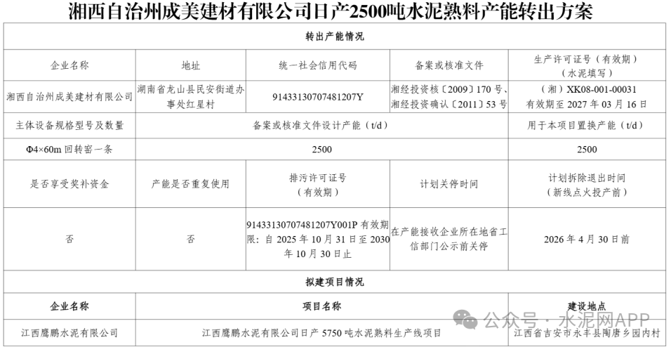 據(jù)了解,湘西自治州成美建材有限公司出讓2500t/d產(chǎn)能至江西鷹鵬水泥有限公司,用于補充4500t/d至5750t/d,置換比例2∶1。
