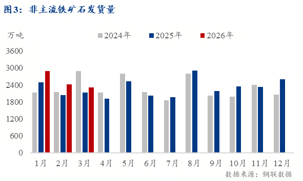 幾內(nèi)亞的發(fā)運(yùn)增長主要得益于西芒杜鐵礦項(xiàng)目的投產(chǎn)。該項(xiàng)目于2025年11月正式投產(chǎn),12月開始穩(wěn)定發(fā)貨,但受貨運(yùn)環(huán)節(jié)的限制,2026年1-2月份發(fā)運(yùn)量偏低,3月初新一批機(jī)車加入,發(fā)運(yùn)量開始提速,3月份發(fā)運(yùn)量翻倍,至4船/月。