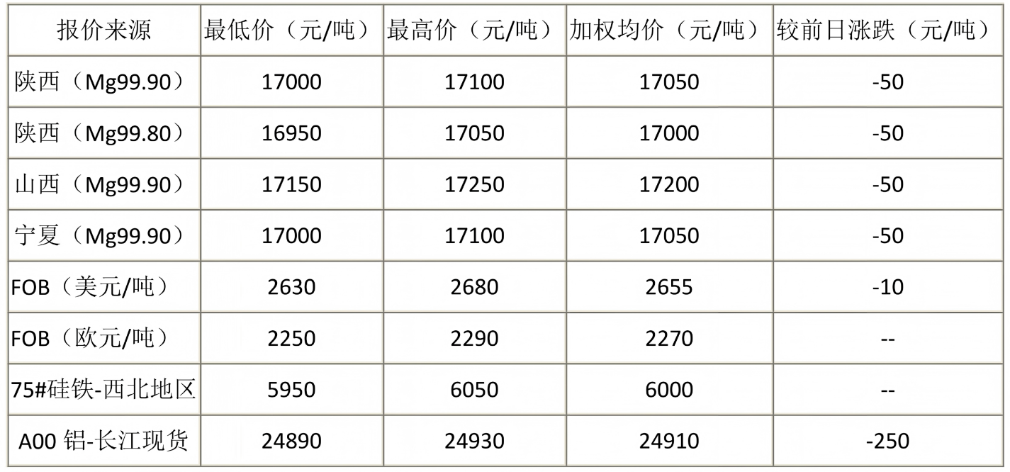2. 原鎂報(bào)價(jià)為按照?qǐng)?bào)價(jià)企業(yè)產(chǎn)量加權(quán)計(jì)算后所得平均值,并按50元/噸取整;3. 表中價(jià)格均為現(xiàn)貨含稅、現(xiàn)金、不酸洗價(jià),國(guó)內(nèi)單位為元/噸;4. FOB為天津港離岸價(jià)格。
