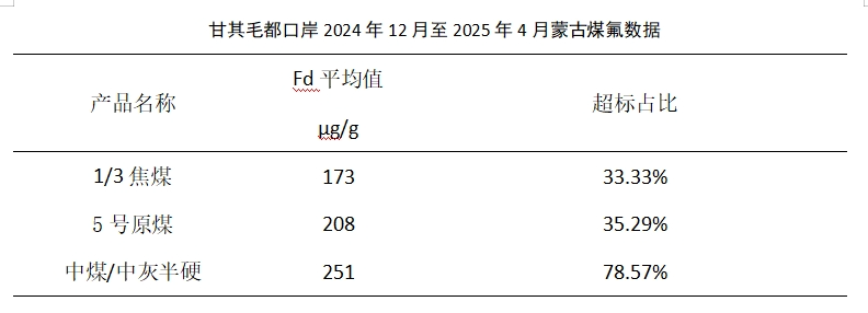 今日智庫對2024年12月至今甘其毛都口岸送檢的蒙古煤有害元素?cái)?shù)據(jù)進(jìn)行統(tǒng)計(jì),未發(fā)現(xiàn)有砷汞氯元素超標(biāo),未發(fā)現(xiàn)精煤的有害元素超標(biāo)。64個(gè)樣本中僅有1例磷超標(biāo)。其中氟的測試情況分產(chǎn)品如下: