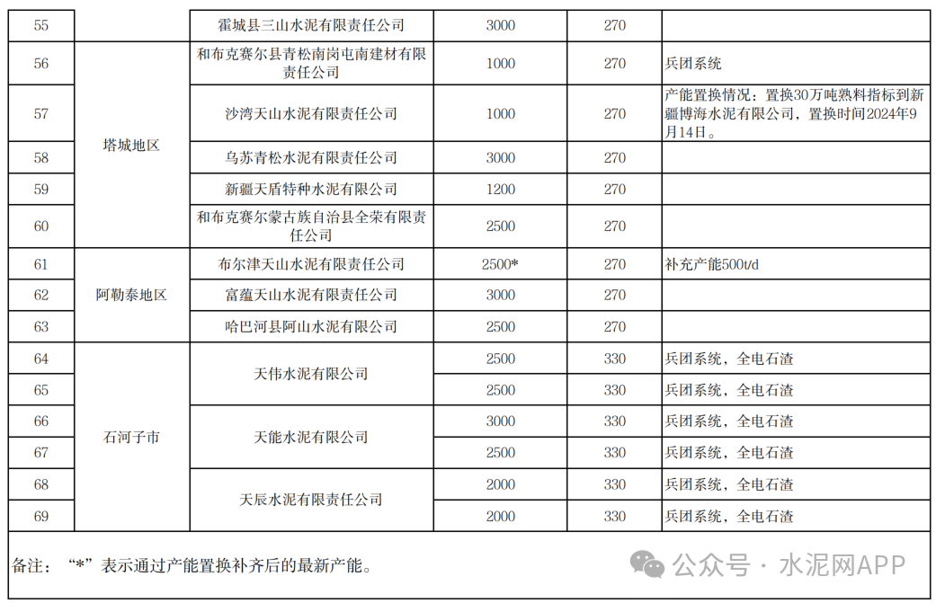 截至2024年底,新疆共計水泥熟料生產(chǎn)線69條,其中5條熟料線補充產(chǎn)能,分別是:新疆博海水泥有限公司補充產(chǎn)能500t/d