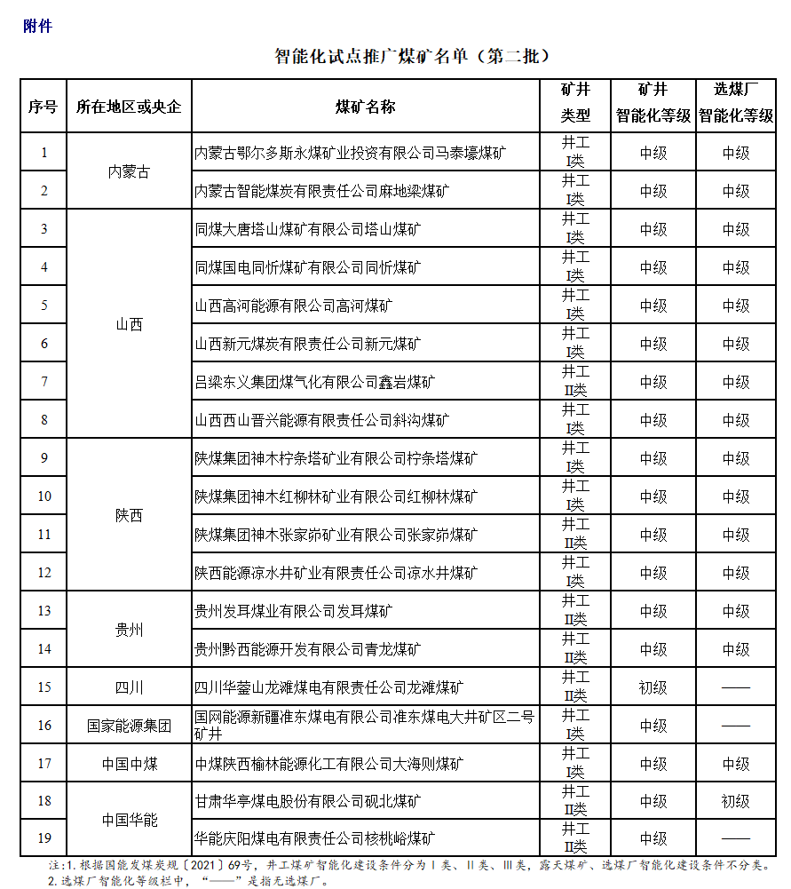 國家能源局綜合司關(guān)于第二批智能化試點推廣煤礦的公示